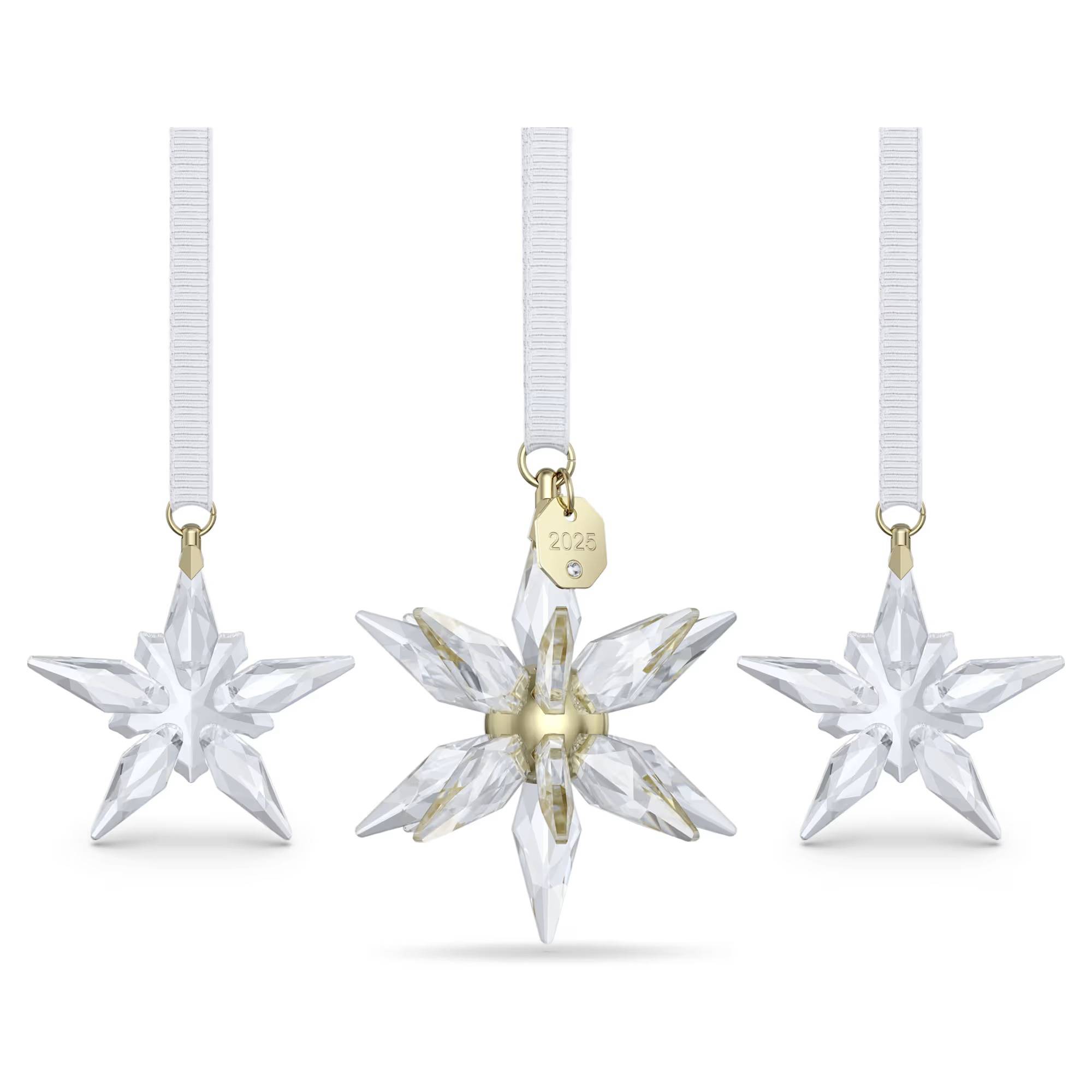 Questo Annual Edition Set Decorazioni 3D porterà una magia piena di luce a qualsiasi arredamento festivo. Il trio scintillante per il 2025 si ispira alla serenità del cielo notturno e presenta una Annual Edition Decorazione 3D e due Decorazioni Little Star. In totale, il set è realizzato con 773 sfaccettature di precisione, con ogni creazione sospesa a un nastro in gros-grain bianco con dettagli placcati in tonalità oro champagne, tra cui una targhetta con inciso “2025” sulla grande stella 3D. Una straordinaria collezione di decorazioni per illuminare il tuo albero o creare un centrotavola radioso per le tue feste. Oggetto decorativo. Non è un giocattolo. Non adatto a bambini di età inferiore ai 15 anni.