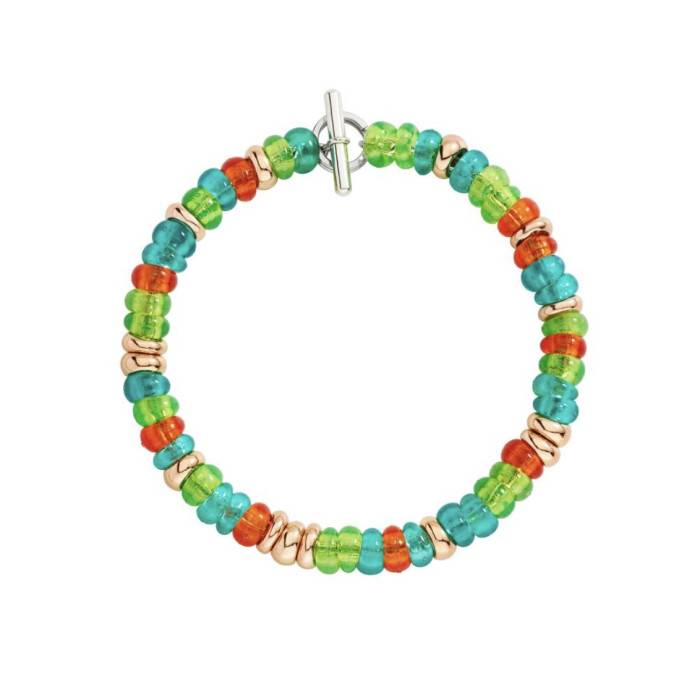 I colori della natura tropicale accendono il nuovo bracciale Rondelle in plastica recycled e argento, da indossare con il nuovo charm Colibrì in smalti perlati.