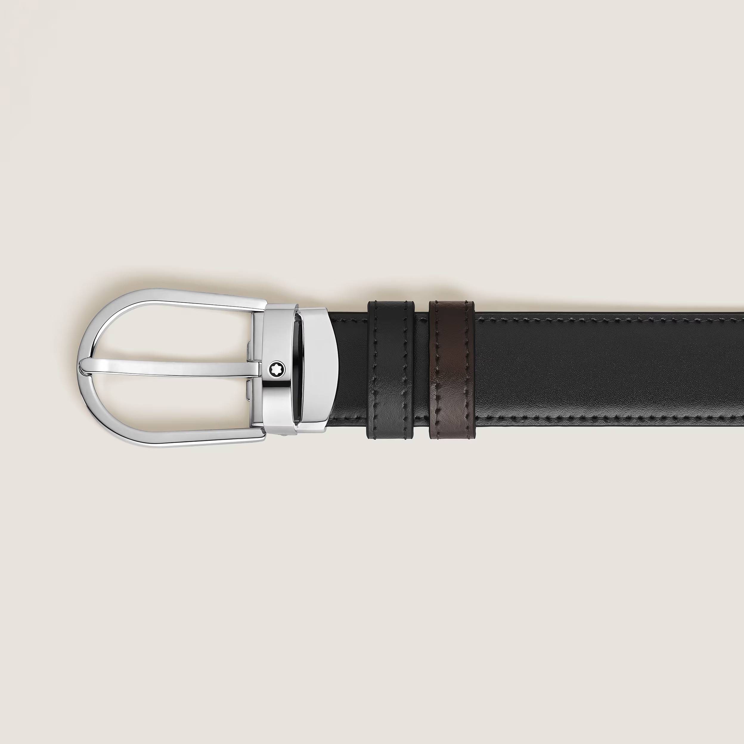 This 30 mm reversible leather belt exudes understated sophistication. One side is made of smooth black Meisterstück leather, with a timeless and elegant finish, while the other is crafted from the same luxurious material in a rich ebony hue for a refined touch. The belt is completed by the distinctive Montblanc horseshoe pin buckle with shiny palladium finish.