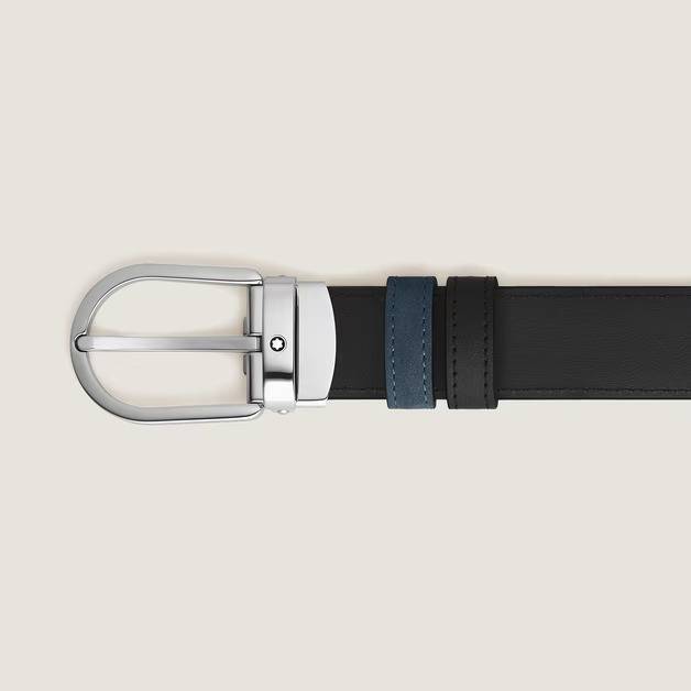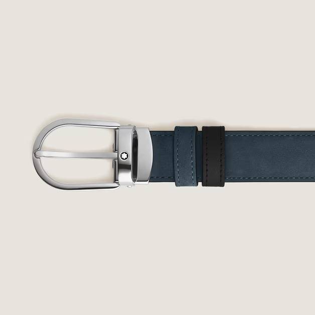 With soft-touch velvety blue suede on one side and smooth black leather on the other, this 30 mm belt offers two styles. The shiny palladium-coated horseshoe buckle creates a timeless look, complemented by the Montblanc emblem.