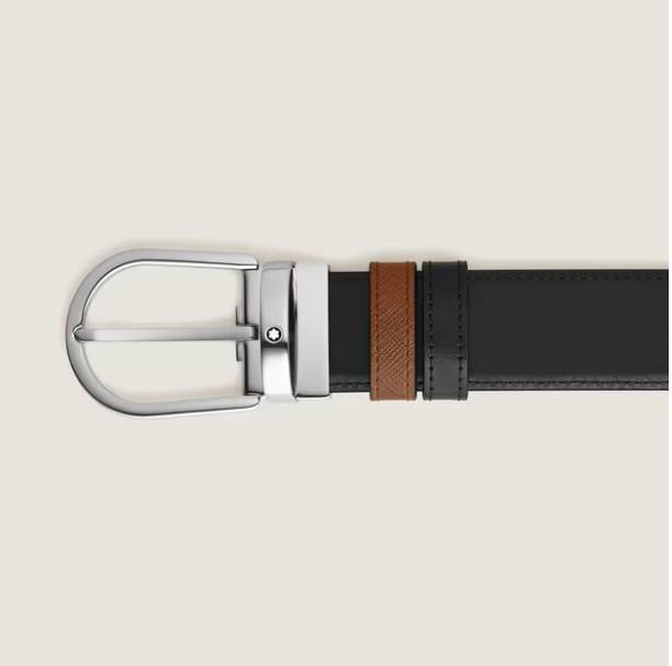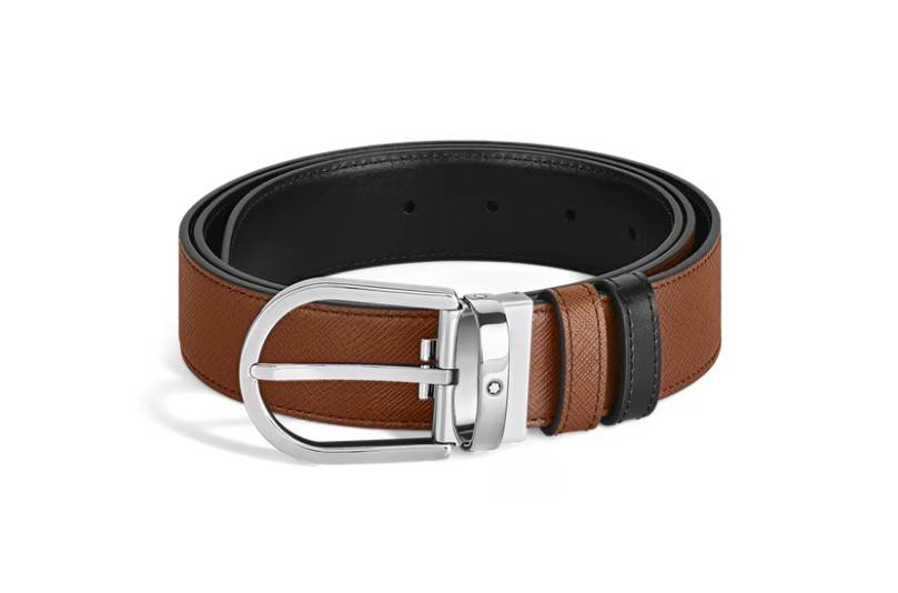 This reversible belt combines elegance and versatility, offering two distinctive styles in one accessory. Featuring our signature palladium-coated Montblanc horseshoe buckle, one side of the 35 mm belt is made of tawny Saffiano-print leather, while the other is made of sophisticated black Meisterstück leather for classic sophistication.