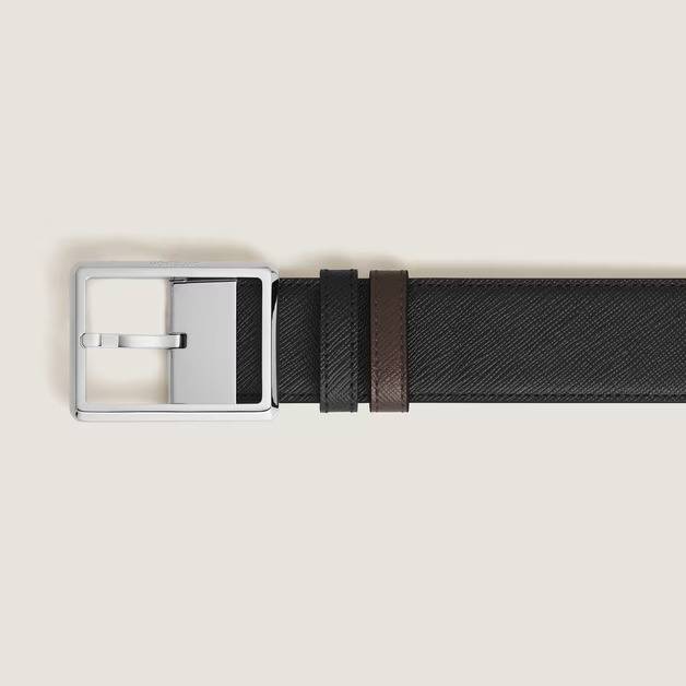 Scopri la raffinata versatilità di questa cintura reversibile da 35 mm in pelle. Questa fibbia rettangolare formale, finitura palladio lucido, apporta un tocco elegante ai look più formali. La cintura è realizzata in pelle Sartorial goffrata con un lato in classico nero e l’altro in una ricca sfumatura ebano si declina in maniera versatile e sobria per completare la tua tenuta.