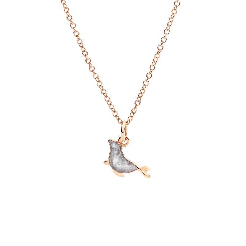 Il Ciondolo Foca di DoDo è realizzato in oro rosa 9K e smalto grigio con effetto madreperla, simbolo di dolcezza, ironia e divertimento. Questo charm fa parte della collezione Animali e include un cordino nero che ne esalta la versatilità e lo stile. Perfetto per chi cerca un gioiello giocoso e raffinato con un messaggio positivo.