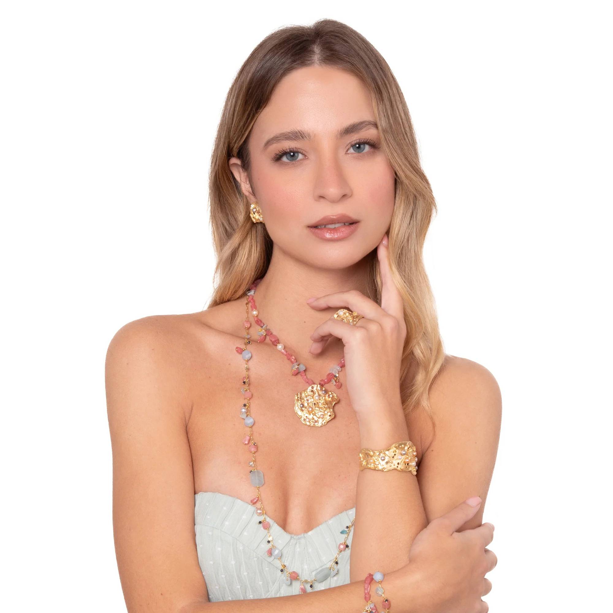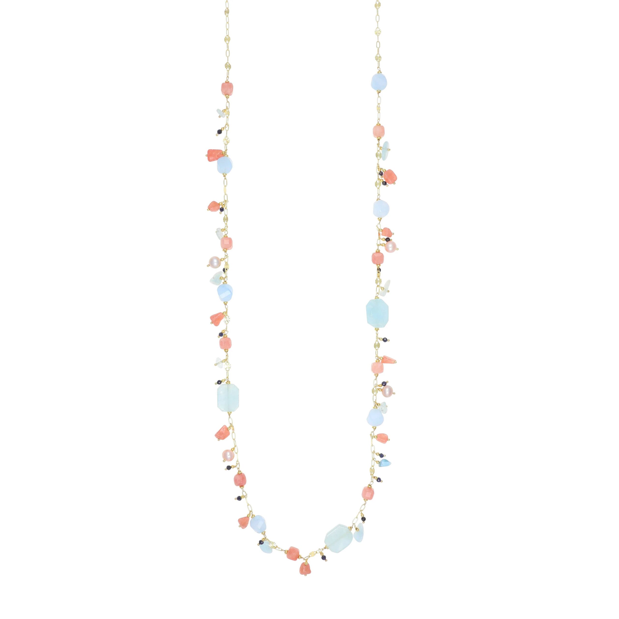 La collana lunga Kaely è un gioiello dalla bellezza fluida e bohémien, progettato per avvolgere la figura con un tocco di eleganza disinvolta e raffinata. Con la sua generosa lunghezza di 83 cm, questa creazione in argento 925 placcato oro giallo si distingue per il ritmo armonioso con cui alterna gemme naturali dai tagli e dalle sfumature differenti, creando una composizione che appare leggera e aerea pur essendo ricca di dettagli preziosi.