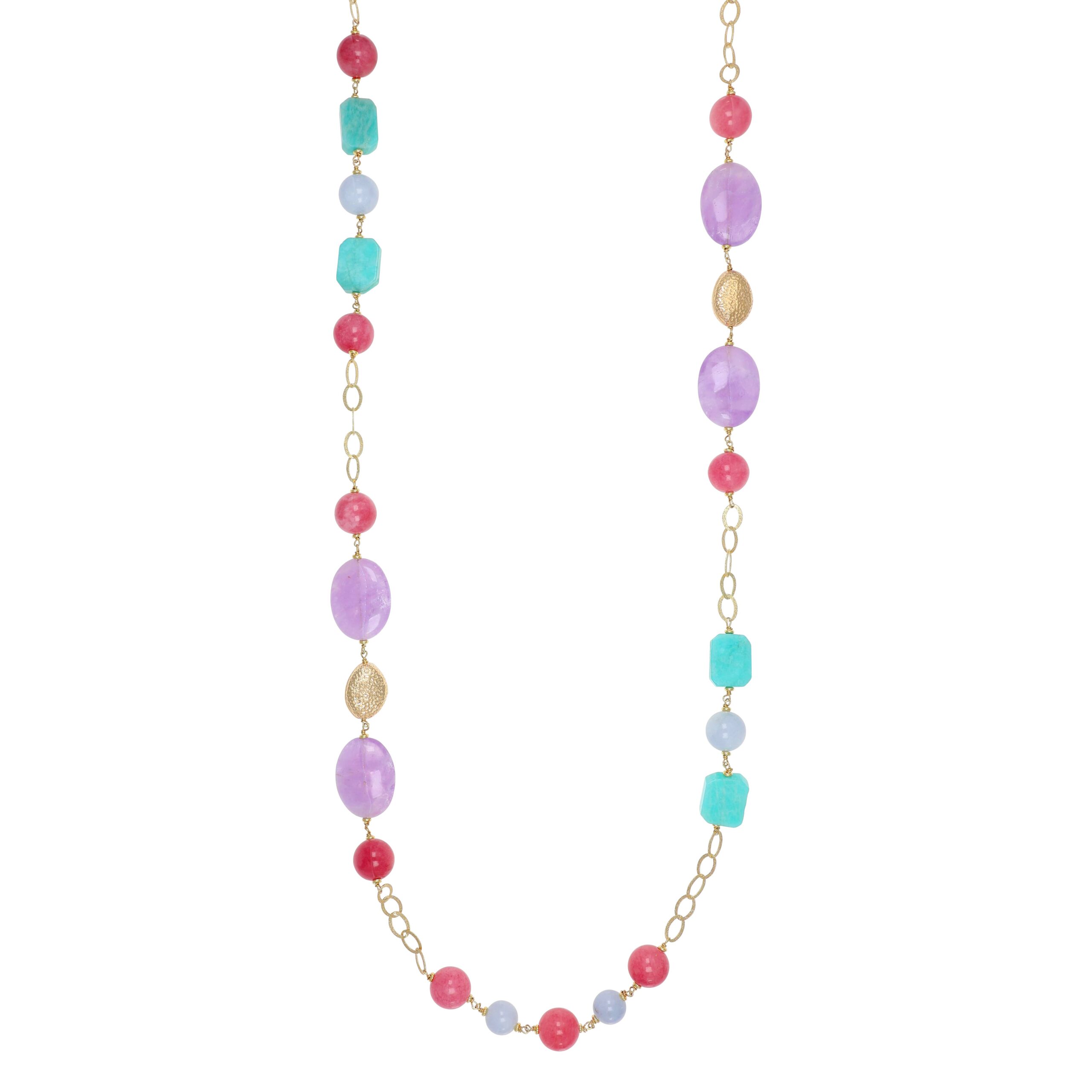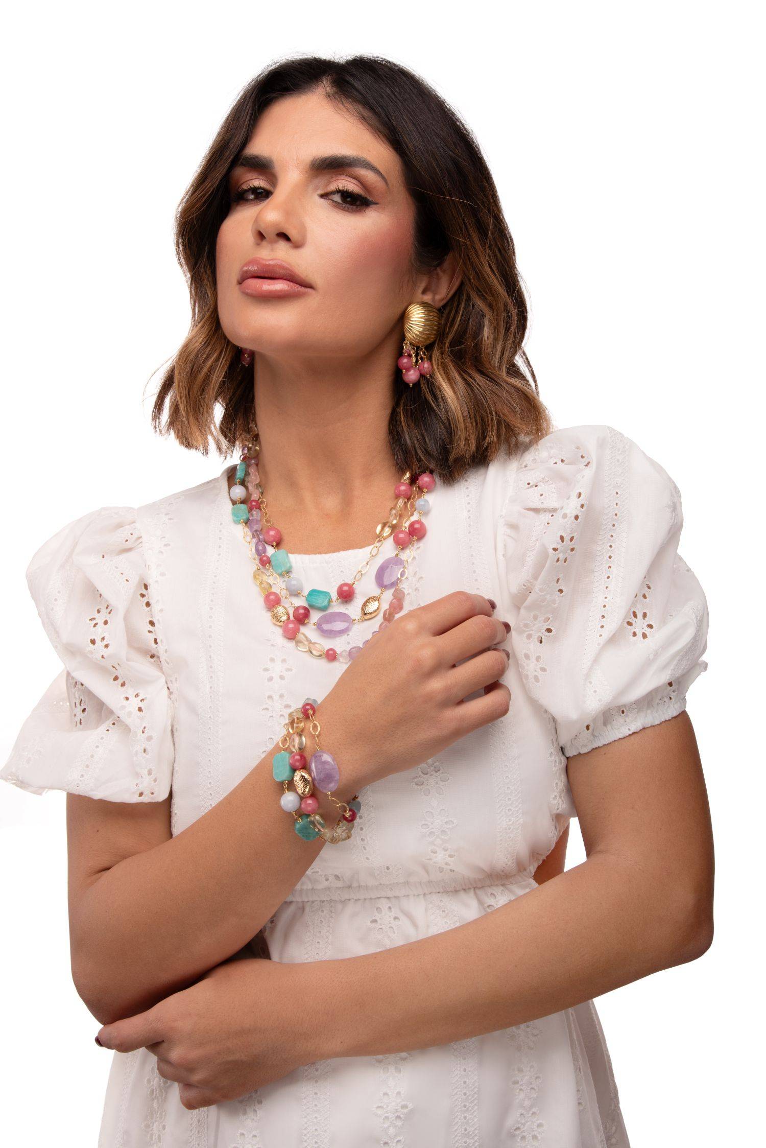 La collana Kandy è realizzata in argento 925 con quarzo fragola, amazzonite e giada tormalina