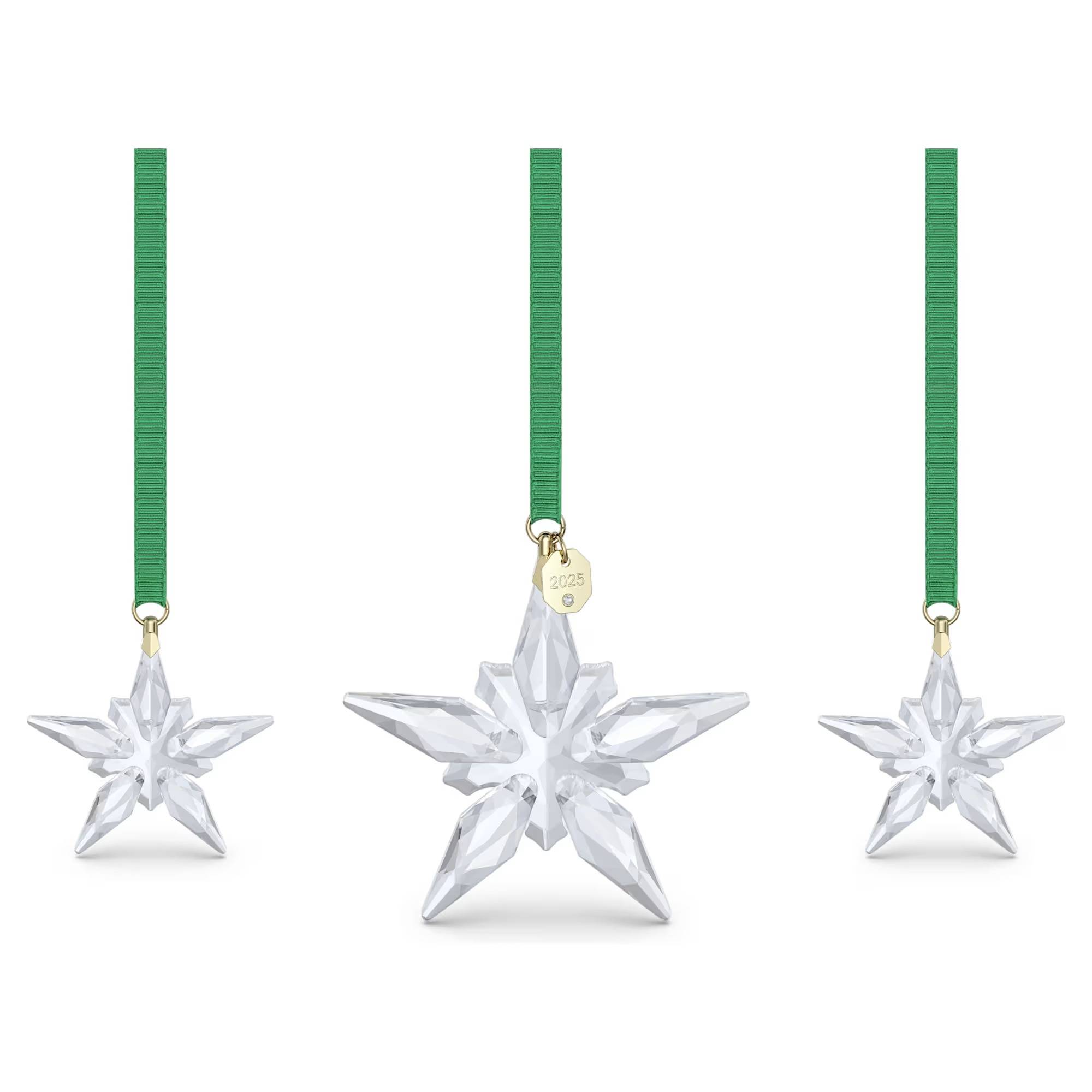 Questo magico set per le feste porta avanti l’iconica tradizione delle Annual Edition Decorazioni di Swarovski. Il set presenta tre stelle trasparenti, realizzate con un totale di 570 sfaccettature, che si ispirano alla serenità del cielo notturno. Ciascuna stella è sospesa ad un nastro in gros-grain verde con dettagli placcati in tonalità oro champagne, mentre la stella grande include anche l’incisione “2025” sulla targhetta. Pensato appositamente per le festività natalizie, questo set commemorativo è un regalo davvero elegante o un perfetto elemento decorativo per la tua casa. Oggetto decorativo. Non è un giocattolo. Non adatto a bambini di età inferiore ai 15 anni.