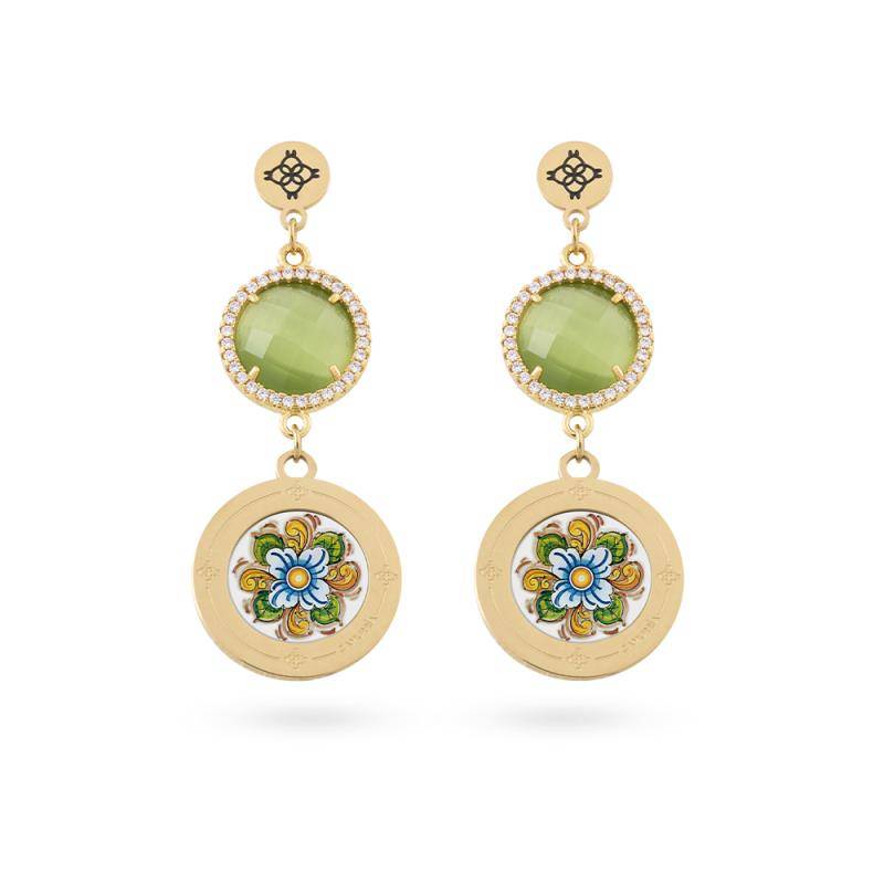 Orecchini gold impreziositi da strass e quarzi idrotermali. Un gioiello unico, con i classici motivi delle maioliche siciliane.