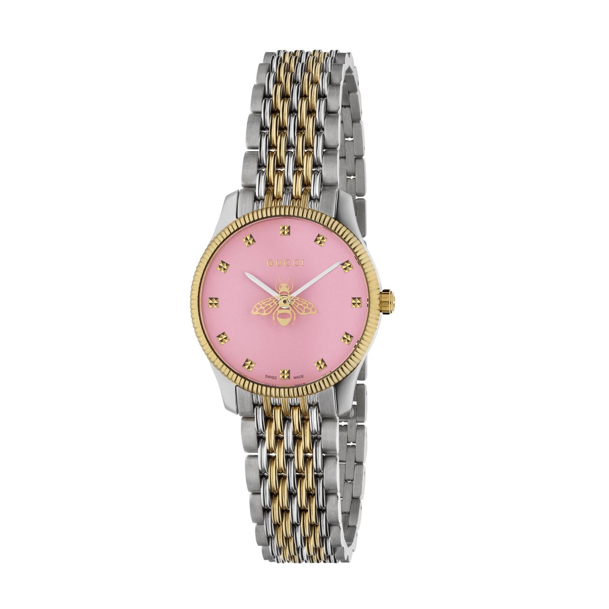 La collezione G-Timeless continua ad esplorare i codici emblematici della Maison in nuovi modi ogni stagione. L’immagine dell’ape, un elemento caratteristico di Gucci, aggiunge un tocco raffinato al modello. Il quadrante rosa è combinato a un bracciale in acciaio e PVD oro giallo.