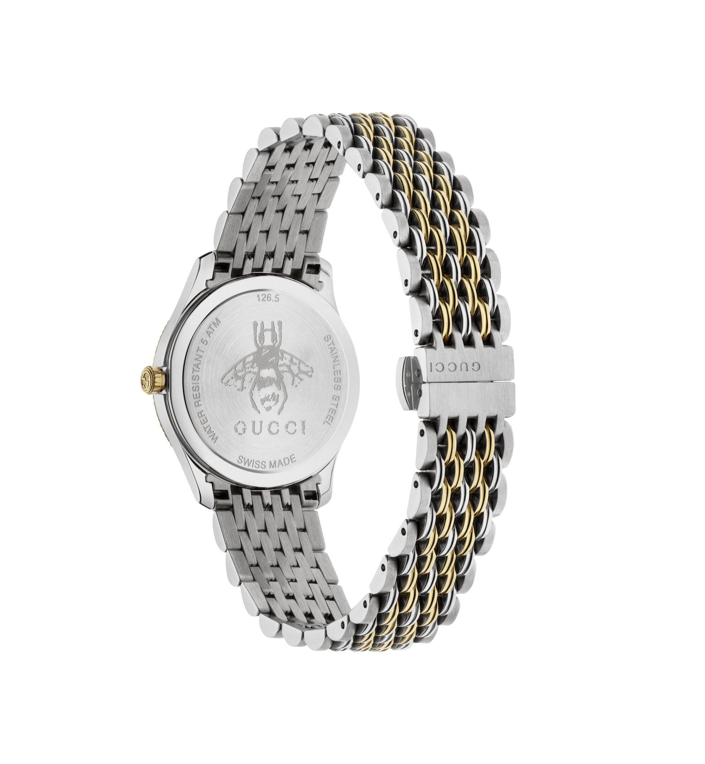 The G-Timeless collection continues to explore the House’s emblematic codes in new ways each season. The image of the bee, a characteristic element of Gucci, adds a refined touch to the model. The pink dial is combined with a steel and yellow gold PVD bracelet.