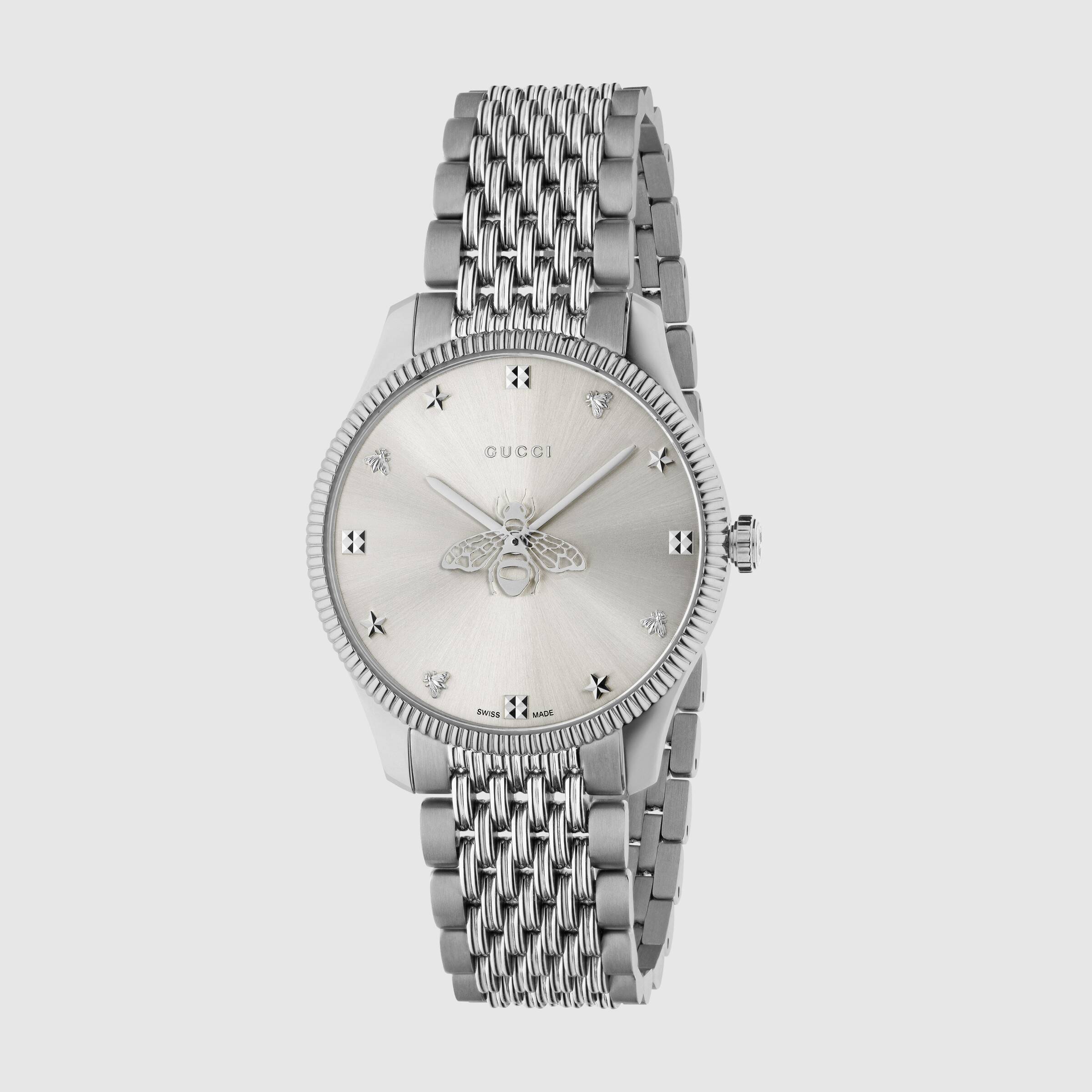 Part of the G-Timeless collection, this steel watch is characterized by its classic design, counterbalanced by a dial with bees and stars. The bee motif defines the second hand.