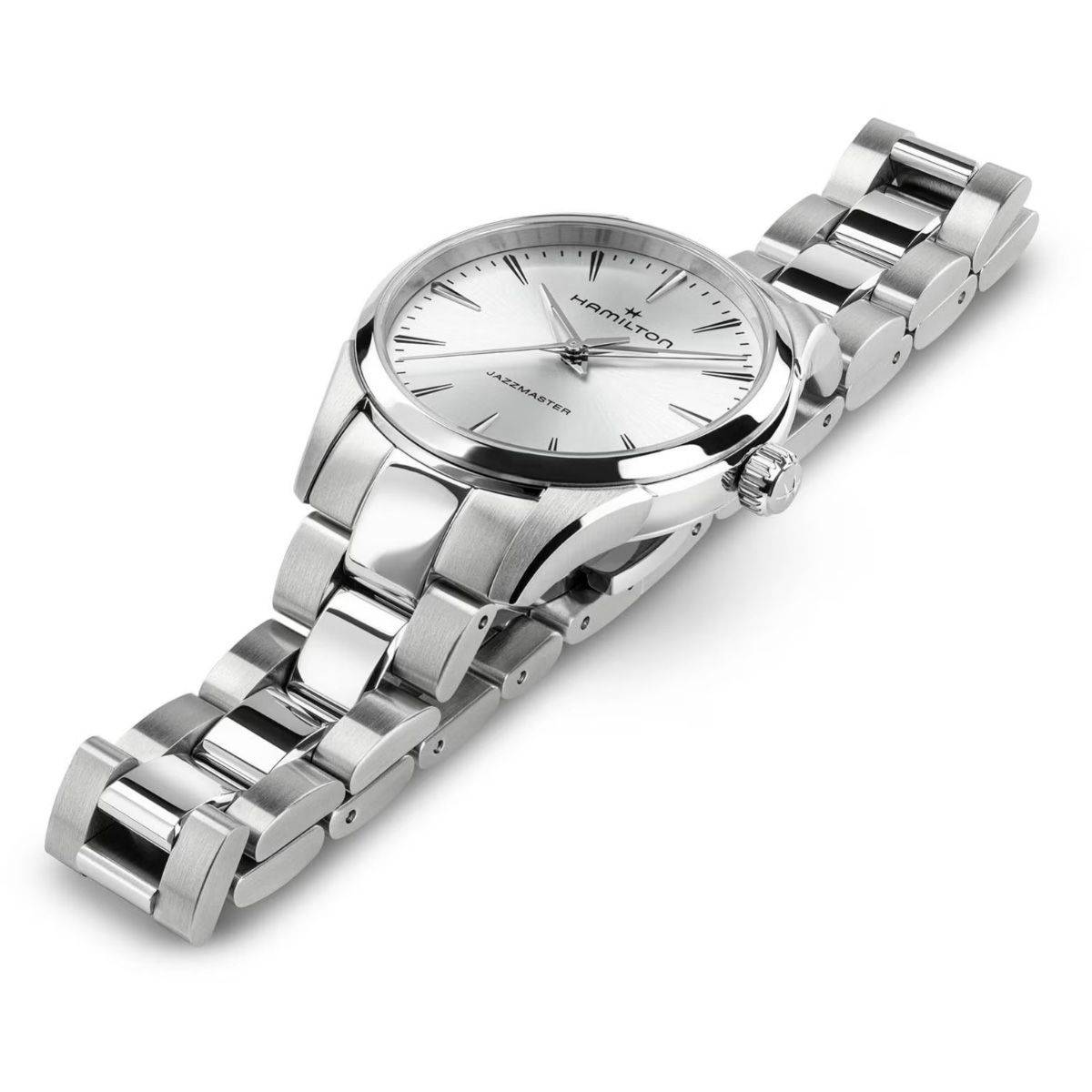 Elegante e moderno, il Jazzmaster Quartz 32 mm si distingue per un quadrante silver spazzolato con finitura soleil, impreziosito da sfere “dauphine” scheletrate, che conferiscono un tocco moderno allo stile tradizionale. La cassa ultrasottile e i dettagli lucidi e spazzolati creano una silhouette elegante. Un orologio classico ed elegante che unisce energia vitale e raffinatezza senza tempo.